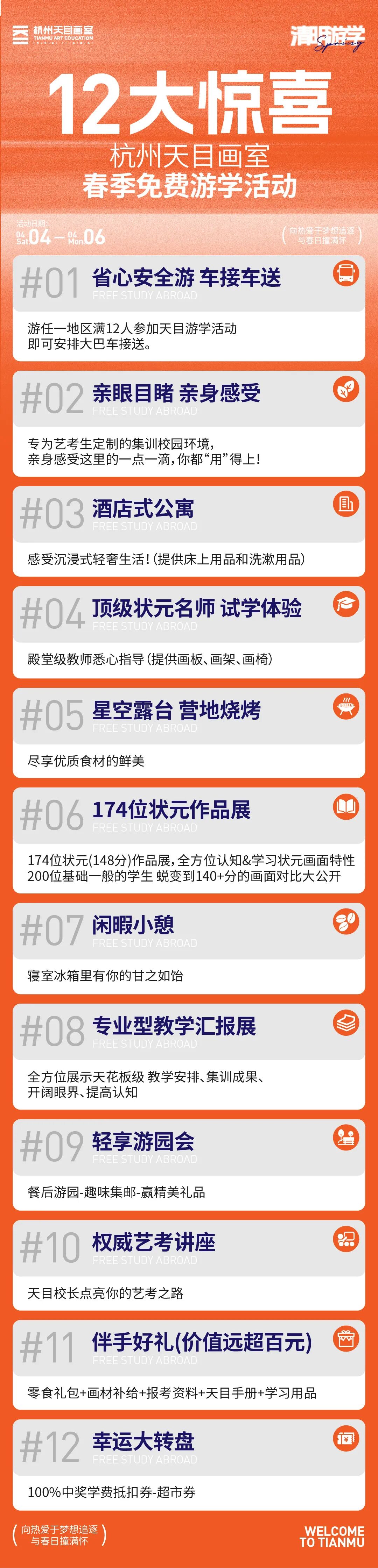 任一地区满12人参加天目游学活动,即可安排大巴车往返接送!免除路途奔波劳累,让同学们轻松抵达画室;我们已经做好十足准备,迎接每一位同学的到来!